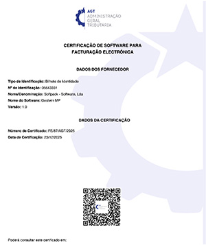 - Software de faturação Certificado pela AGT, cumprindo com todos os requisitos legais; Certificados nºs 125 e 118.